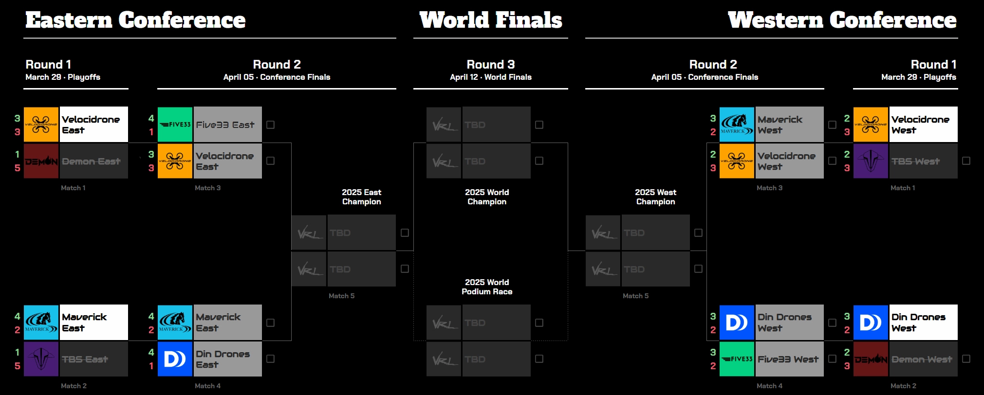 | Match 1 | Â Velocidrone East | vs. | Â Five33 East |